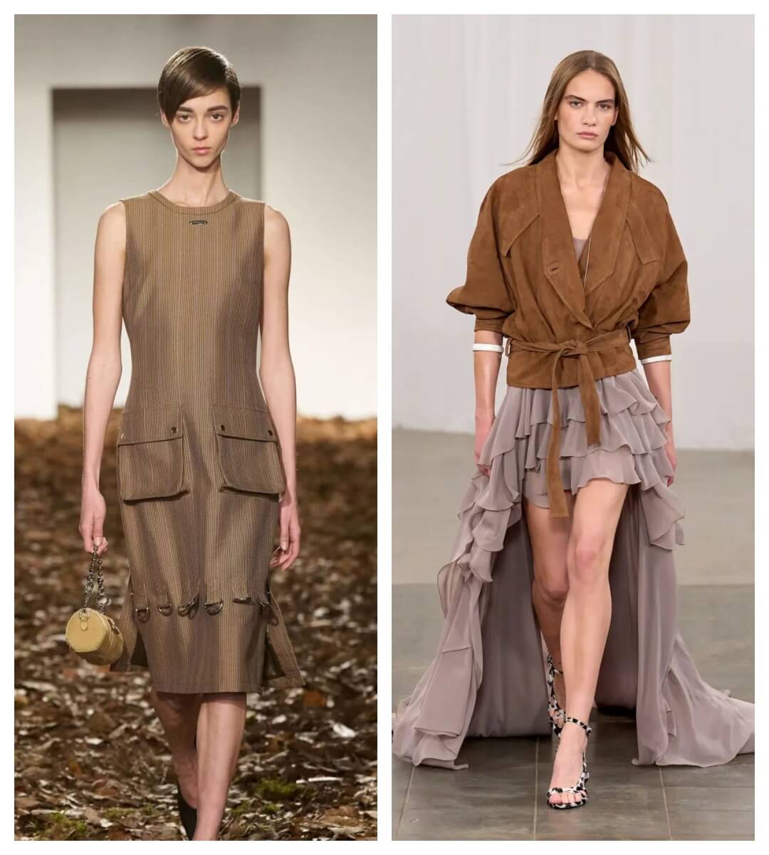 青铜棕将矿石的天然斑驳与金属光泽精妙融合,似青铜器历经岁月打磨的氧化表层,在可持续风潮中诠释“有机奢华”。作为棕色调的升华,这种色彩承载着大地与时间的双重叙事,当光线掠过面料,仿佛触摸到地壳深处的矿脉,沉稳中迸发原始力量