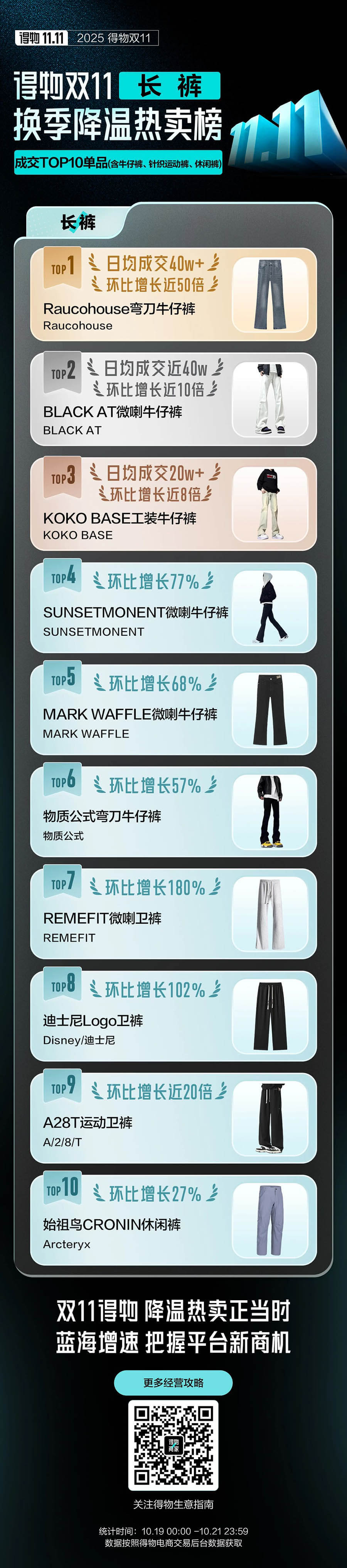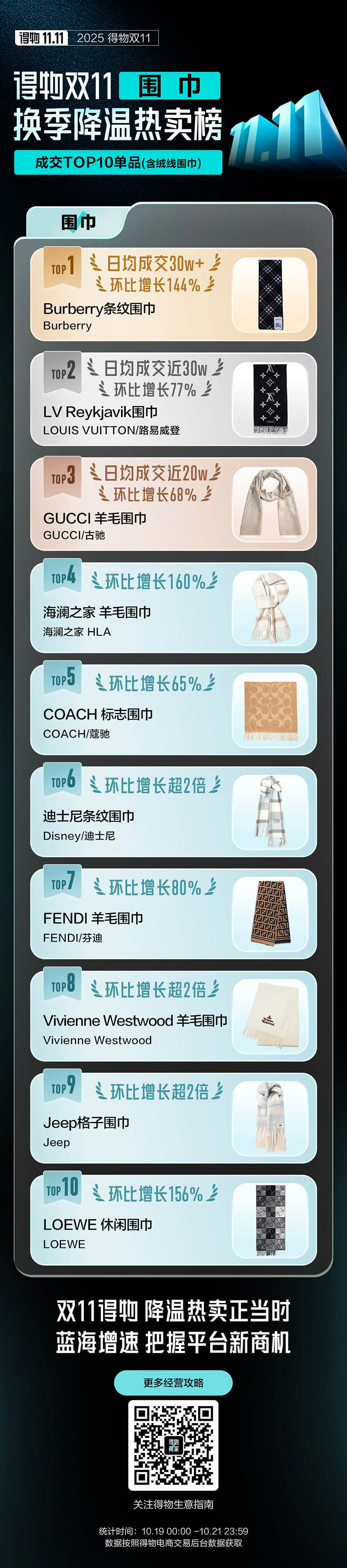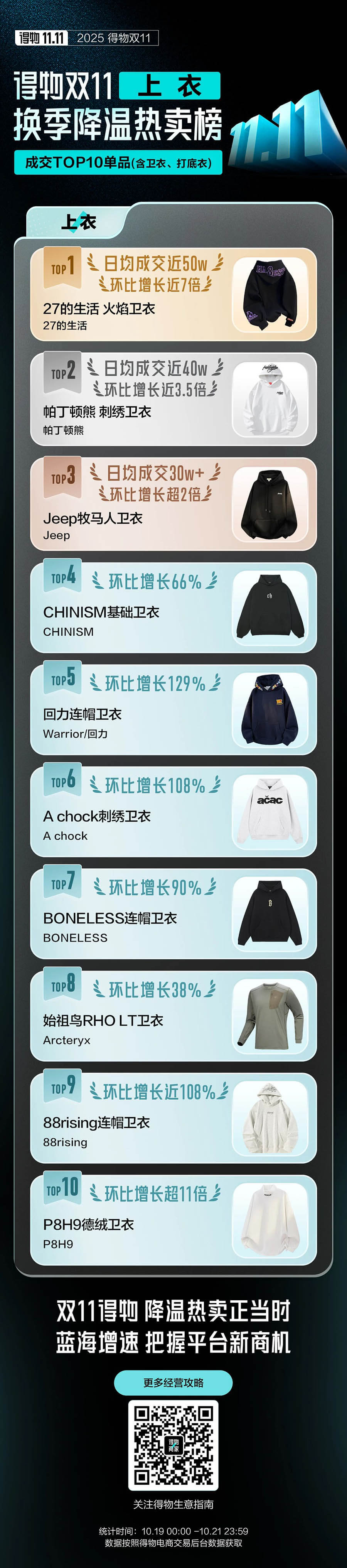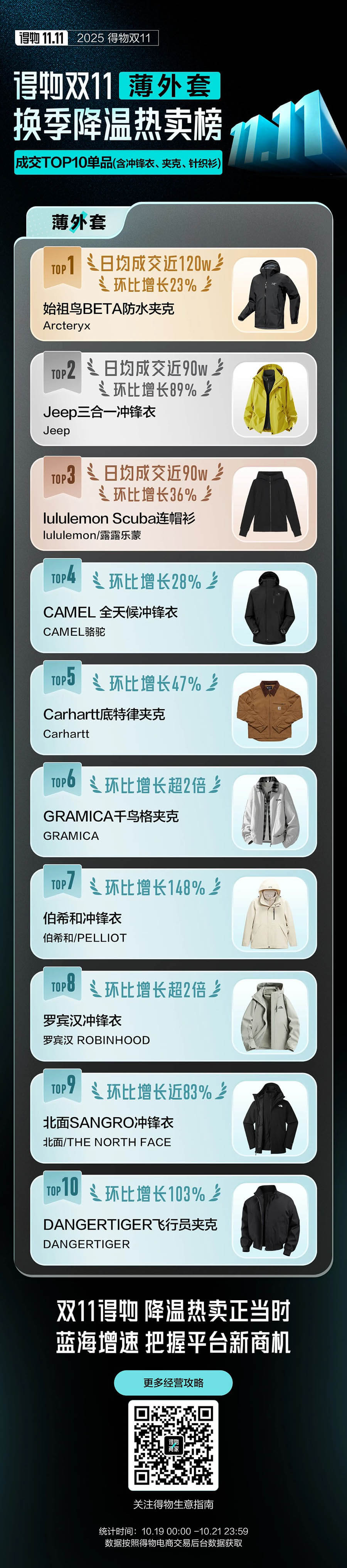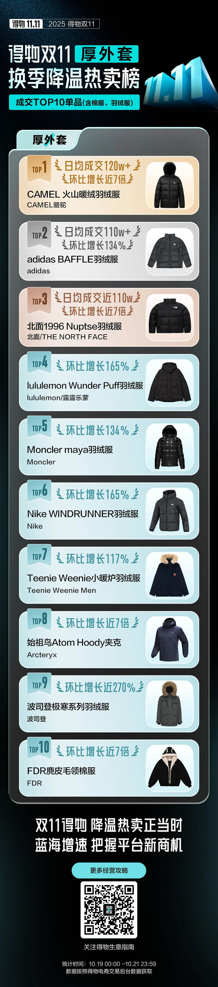 10月份,伴随全国大范围的换季降温,服饰品牌在今年双11率先迎来秋冬品类销售爆发。作为聚焦年轻消费趋势的潮流阵地,得物发布了双11降温热卖榜单,包括厚外套、薄外套、上衣、长裤、围巾。
