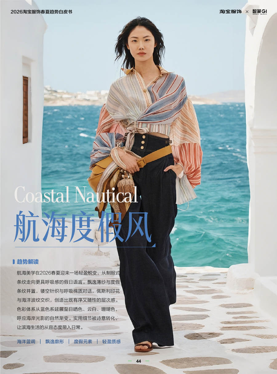 2026年的航海风,褪去硬朗制服感,转向轻盈浪漫的假日语言。飘逸薄纱与呼吸感棉质对话,佩斯利印花与波纹线条交织。色彩从经典蓝调延伸至日晒色、云白、珊瑚色的自然渐变,仿佛将海岸线的渐变光影穿在身上,让度假的从容渗透进日常生活。