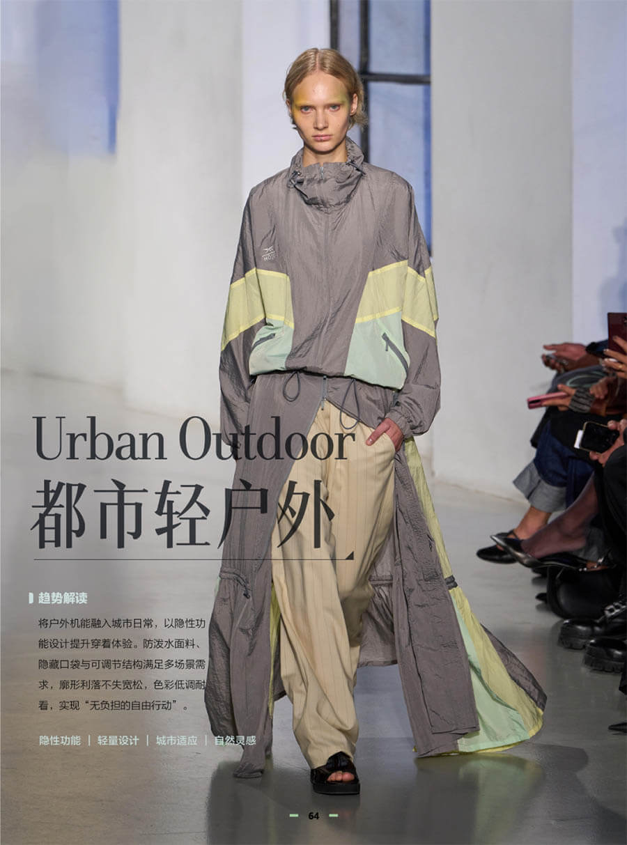 户外机能悄然潜入城市衣橱,通过隐性设计满足多场景需求。防泼水面料、隐藏口袋、可调节结构被巧妙融入,廓形利落宽松,色彩低调耐看。在城市与自然之间自由切换,实现“无负担的自由行动”。