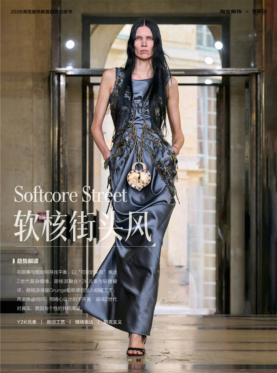 在甜美与颓废之间,Z世代找到了自己的表达平衡点。“可控的失控”成为情绪出口——甜核派融入Y2K元素与轻微破坏感,颓核派在粗粝质感中加入细腻工艺。看似不完美,实则精心设计,诉说着一代人对真实、脆弱与个性的共同渴望。
