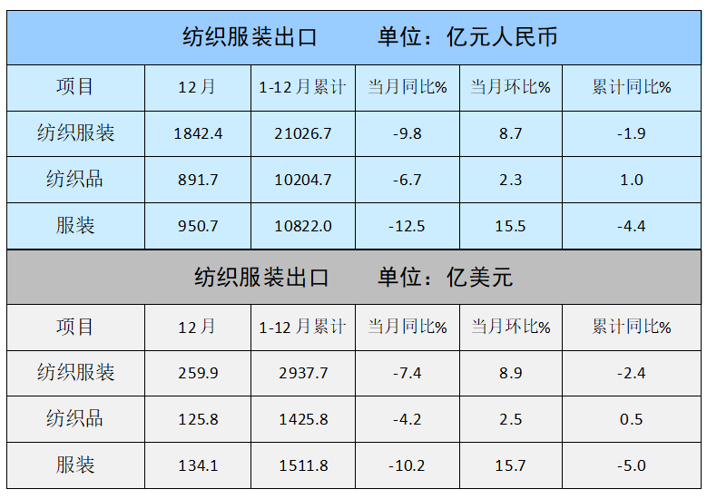 2025年1-12月,纺织服装累计出口2937.7亿美元,下降2.4%,其中纺织品出口1425.8亿美元,增长0.5%,服装出口1511.8亿美元,下降5%。12月,纺织服装出口259.9亿美元,下降7.4%,环比增长8.9%,其中纺织品出口125.8亿美元,下降4.2%,环比增长2.5%,服装出口134.1亿美元,下降10.2%,环比增长15.7%。