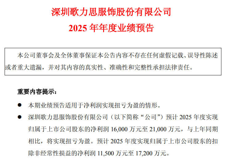 歌力思:预计2025年度归属于上市公司股东的净利润为1.6亿元至2.1亿元,同比实现扭亏为盈;扣除非经常性损益后的净利润为1.15亿元至1.72亿元,显示主营业务已恢复盈利能力。