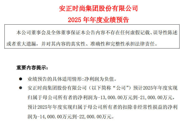 安正时尚:预计2025年度归属于母公司所有者的净利润为-1.3亿元至-2.1亿元,扣除非经常性损益后的净利润为-1.4亿元至-2.2亿元,延续亏损态势,且亏损幅度扩大。