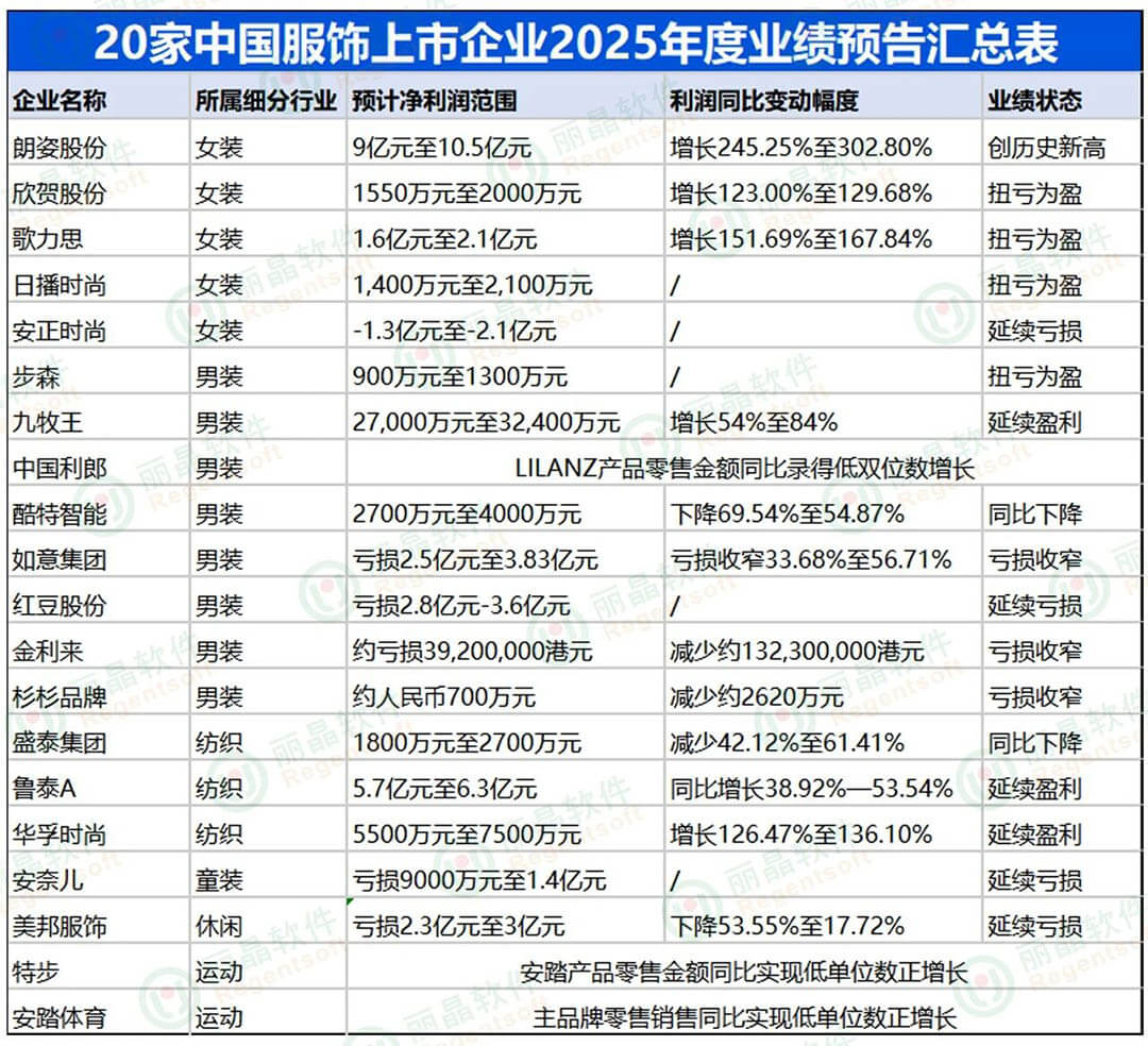 ▲数据来源:服饰上市企业财报预告 制表:丽晶软件