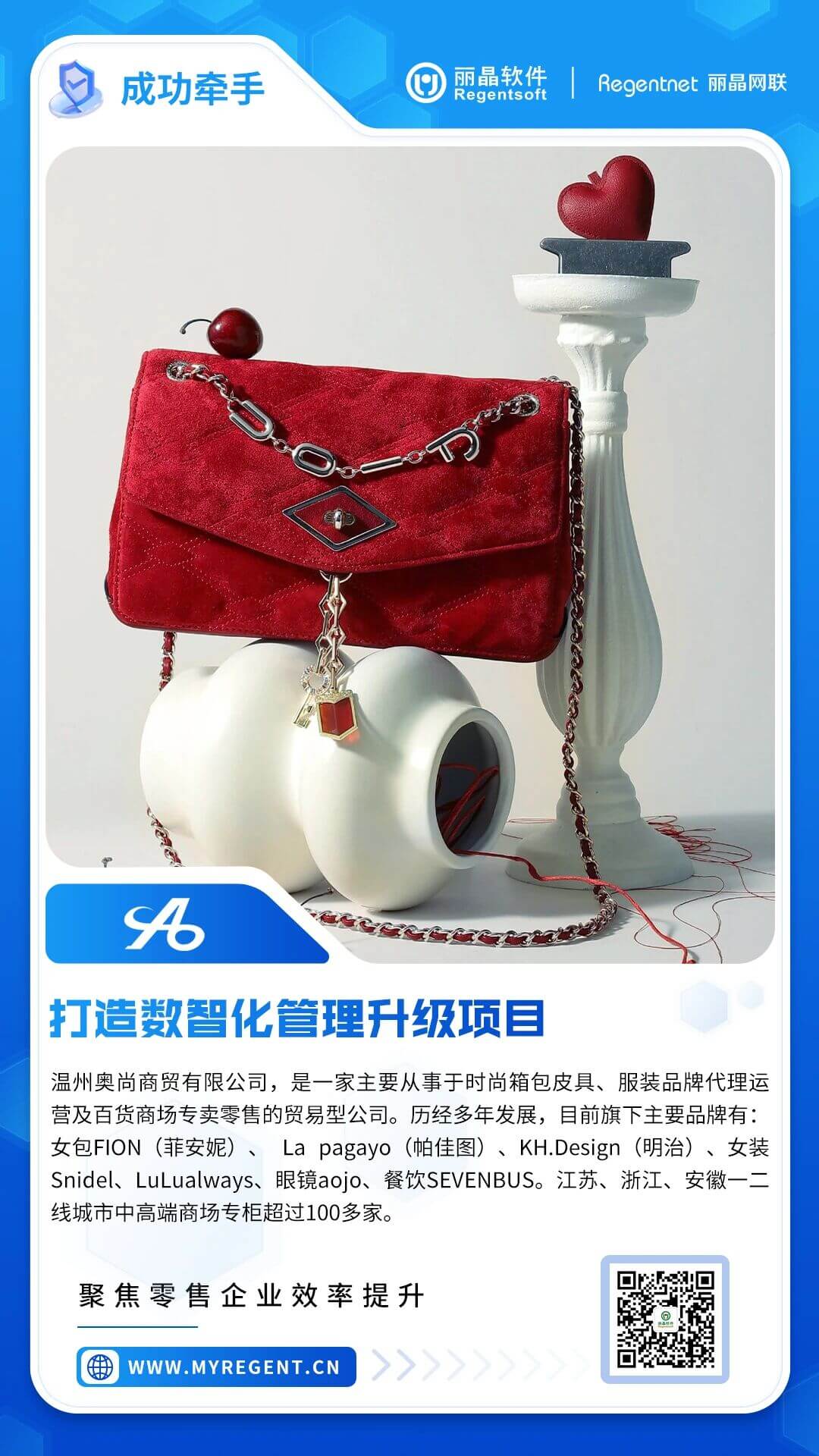 近日,丽晶软件与温州奥尚商贸有限公司正式达成合作。双方将携手打造数智化管理升级项目,以数字化力量赋能奥尚旗下多品牌矩阵的协同运营与跨区域精细管理,助力这家深耕时尚零售领域多年的贸易型公司,在规模化发展中构建更高效、更智能的运营体系。