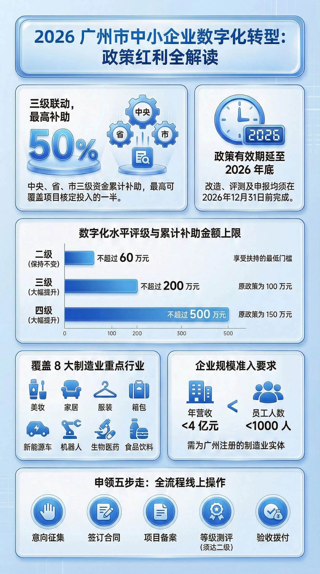 近日, 广州市工信局发布《关于2026年中小企业数字化转型城市试点有关工作的通知》,指出2026 年数字化转型试点政策全面升级,我市省级试点扶持政策直接延续到2026年12月31日。
